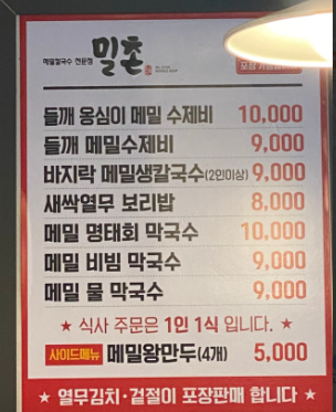 막국수와 칼국수 및 수제비가 주력 메뉴인 밀촌입니다. 밀촌은 학원가 소방서 뒷 쪽 골목에 있는데요. 점심 시간이 되면 웨이팅이 생길 정도로 손님이 많습니다. 가격도 한 끼 식사하기 좋고 맛도 고소하고 맛 있어서 저희 가족도 자주 방문하는 맛집입니다. 가볍게 한 끼 식사 (특히 점심식사) 하실분은 밀촌 추천드립니다! 추가적으로 열무김치와 겉절이 김치를 따로 포장 판매하고 있으니 참고 부탁드립니다!