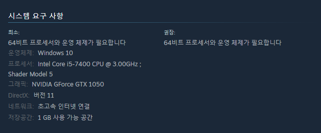그래픽 카드가 GTX 1050으로 유난히 높게 적혀있습니다. 정보에 의하면 GTX 280만 넘어도 정상적으로 플레이가 가능하다고 합니다.