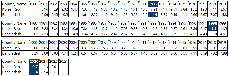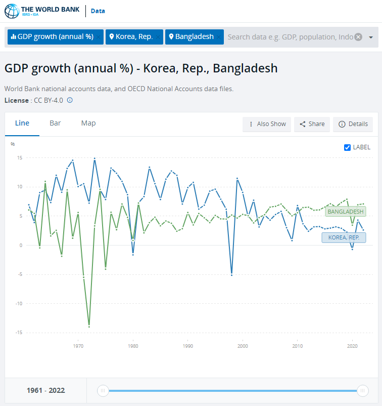위에서 보여주는 그래프 및 테이블은 한국과 방글라데시의 1961년도부터 2022년까지의 경제 성장율입니다. 경제 성장율이란 한 국가의 국내 총생산(GDP, Gross Domestic Production)이 어느 정도의 속도로 증가하고 또는 감소하는 지를 나타내는 지표로서, 국가의 경제 발전 정도를 판단할 수 있는 중요한 자료입니다. 위의 그래프나 테이블에는 그러한 내용이 숫자 또는 선의 정보로서 아주 함축적으로 나타나 있습니다. 전문가나 읽어낼 수 있는 자료입니다. 저는 전문가는 아니고요., 그냥 흥미를 갖고 찾아 다니다 보니 조금 아는 정도이지요. 우선 위 그래프 자료에서 첫번으로 눈에 확 들어오는 것은 1970년대 초반 방글라데시의 경제 성장율입니다. 마이너스 12% 정도에 이를 정도로 아주 심각한 경제 위기가 방글라데시에 발생했습니다. 이를 간단히 말해 보면 저 해의 방글라데시는 경제가 멈추고 뒤로 후퇴를 했다는 뜻입니다. 도대체 저 1970년대 초에 무슨 일이 있었던 것일까요? 테이블을 통해 정확히 해당 년도를 찾아 보면 '1972'도가 바로 그 해입니다. 인터넷을 통해 자료를 찾아 보니 1971년도에 파키스탄(당시 서파키스탄)으로부터의 독립전쟁이 있었으며 이 전쟁에서 승리하여 1971.03.26일자로 독립 국가를 선언하였습니다. 그 다음해인 1972년도에 경제 성장율이 마이너스 14%(-14%)까지 떨어졌습니다. 아무래도 정치 시스템을 우선적으로 안정화 시키기 위해 전력을 다 했을 것임으로 경제에는 힘을 쏟지 못했을 것입니다. 그 부정적인 결과가 저렇게 나타났을 것이구요. 1973년도에 다행히도 플러스 3.33%(+3.33%)로 올라서게 됩니다. 1975년도에는 다시 마이너스로 돌아서게 되는데 이 때는 또 무슨일이 있었던 것일까요? 이 내용도 나중에 기회가 되면 다시 찾아 보도록 하겠습니다. 물론 이 또한 생각이 나면입니다.
