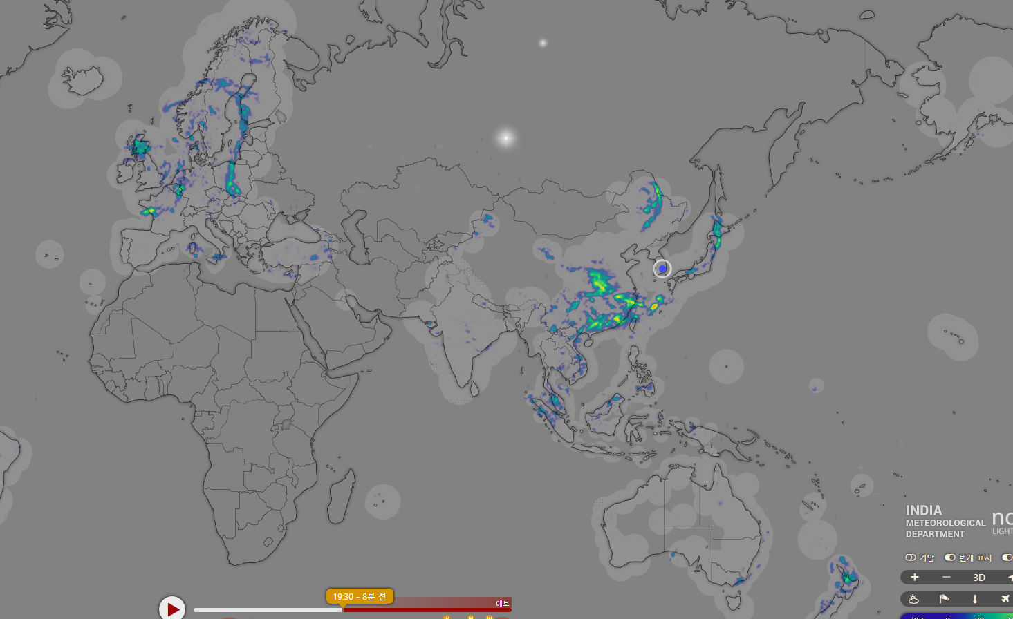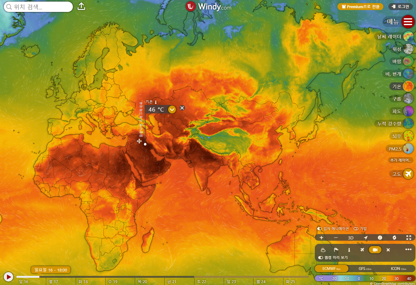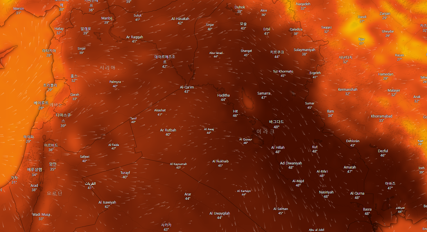 아침에 교회갈 때 온도는 아마도 25~27도 사이가 되지 않았을까 합니다. 그대로 교회에 도착해서 자리를 잡았을 때에는 이미 속옷이 약간 젖어 있는 상태였습니다. 그 짧은 사이에도 땀을 흘린 것이지요. 6월 중순에 이정도 더위는 적당한 듯 하기는 한데 옷이 땀에 젖을 정도였던가 하고 궁금해 졌습니다. 위 화면은 날씨 정보 전문 애플리케이션 'WINDY'의 Desk Top PC 버전에서 캡쳐한 화면입니다. 보는 법 간단합니다. 인터넷에 검색어 'WINDY'를 넣고 검색하면 해당 웹주소가 뜨고 그 주소로 입장하면 가장 위 화면이 뜹니다. 기본 화면입니다. 중부 러시아 바이칼 호수 근처의 하얀 점 보이시나요? 바이칼 호수 위치를 모르시면 구글맵에 가셔서 확인해 보시고요. 저 하얀 점은 바로 번개가 친 것을 보여주는 점입니다. GIF 파일로 저장이 된다면 번개 치는 효과를 볼 수가 있을텐데 제가 그 정도 실력은 아직 안됩니다. 두번째 화면은 오른쪽 메뉴바에서 기온을 누르시면 뜨는 버얼건 화면입니다. 가장 아래에 온도를 나타내는 바챠트가 있는데 30 ~ 40도 정도를 보여주는 색은 역시 빨간색입니다. 하이구야! 보기만 해도 벌써 몸이 뜨겁다고 반응을 합니다. 검붉은 색의 장소는 역시 중동입니다. 열사의 나라 중동, 47도를 보이는 장소는 이라크의 수도 바그다드 지역을 나타내는 화면입니다. 화면 확대를 해서 캡쳐를 하니 48도라고 뜹니다. 그 사이 벌써 1~2도 정도 올라온 것일까요? 저기 저 지역에서는 살수나 있나 모르겠습니다. 지난주에 인도의 북서부 지역에서 50도를 넘었다는 뉴스가 났었는데 지금은 45도 정도를 보이고 있는데 이라크의 지역은 이보다도 더 뜨겁습니다.