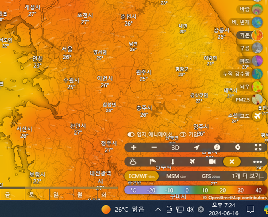 이 앱의 날씨 정보가 정확한지 확인을 해야겠지요. 도대체 어떻게 이 기상정보를 얻는지 그 과정이 정말 궁금해 집니다. 각 국가의 기상청과 계약을 맺을까요? 위성 정보는 어떻게 얻는 것일까요? 다시 돌아 와서 지금 사용하는 컴퓨터의 오른쪽 하단에 제 지역의 온도 정보가 뜨는데 그 정보와 이 앱의 해당 지역 온도 정보가 맞으면 이 앱의 정확도를 확인하실 수 있겠지요. 아래 화면을 보시면 아시겠지만 25~26도 사이를 보이고 있는데 제 컴의 화면에서도 26도 정보를 보이고 있습니다. 정확하네요.