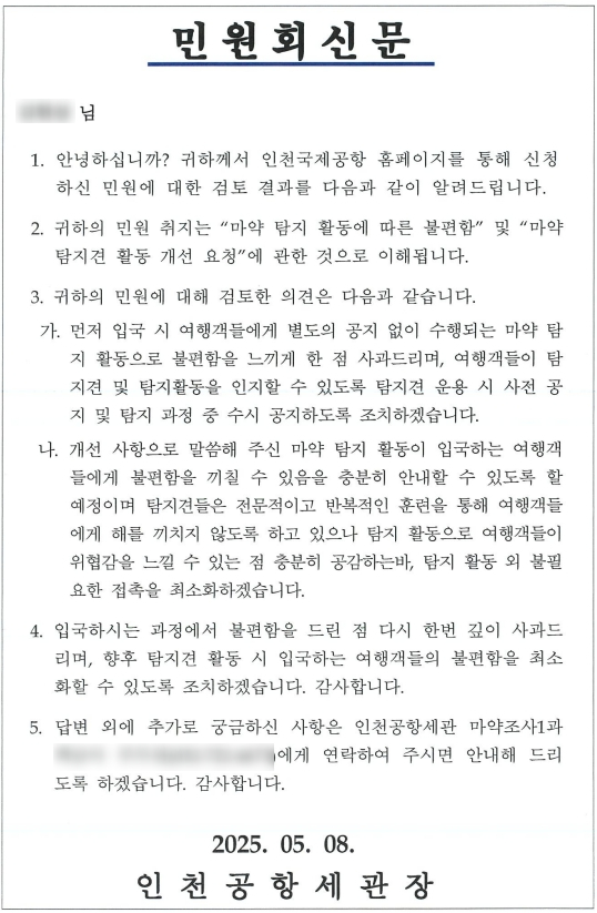 집에 도착해서 컴퓨터를 켜고는 위 마약 탐지견 활동에 대한 민원을 넣었습니다. 마약 탐지견 활동에 대해서 고지를 하고 고객에게 불편함을 끼치지 않도록 노력해 달라라는 민원이었습니다. 이에 대해 인천공항공사로부터 위와 같이 회신을 받았습니다. 마약 탐지견 활동에 대해 수시 공지를 하겠다는 회신입니다. 그 뒤로 출장을 다녀온 적이 없어 개선 조치가 되었는 지는 모르겠습니다. 곧 출장을 다녀올 것 같은데 아직도 개선이 되어 있지 않다면 다른 방법을 취해서 민원을 넣을 생각입니다. 반드시 개선이 되어야 한다고 생각합니다. 여러분 생각은 어떠신지요?